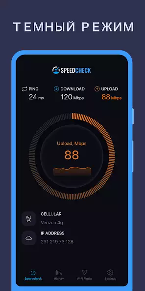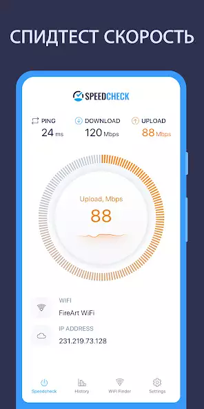 Спидтест — тестер для измерения стабильности, скорости интернет-подключения по Wi-Fi и мобильных сетей 3G, 4G, LTE. Есть раздел настроек, функция автоматической проверки, которая позволяет настраивать периодичность тестирования. Можно узнавать, как будут работать мессенджеры, браузеры, стриминговые и другие сервисы. Имеется показ IP-адреса. Присутствуют русскоязычный интерфейс и обновление данных. Приложение Спидтест содержит рекламу.