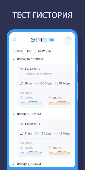 Доступно определение: скорости передачи, приема данных собственной сети и провайдера, точек доступа Wi-Fi, времени задержки запроса-ответа от сервера. Программа сохраняет детализированную историю тестирований, позволяет делиться информацией с другими пользователями, сортировать и смотреть ее на графиках. Для корректной работы приложения требуется разрешить доступ к местоположению, устройству. Имеется время проведения тестов. Есть светлый и темный режимы.