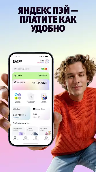 Яндекс Пэй — онлайн-кабинет для управления банковскими продуктами, оплаты покупок в магазинах, получения до 50 % кешбэка бонусными баллами. Доступна проверка баланса. Поддерживается оплата по QR-коду, посредством устройств с NFC-модулем, включая смарт-часы на Wear OS 2 и выше. Можно выбирать категории товаров для получения бонусов. Имеется определение способа расчета.