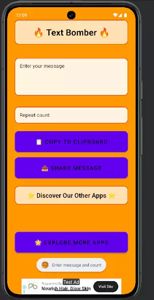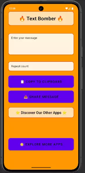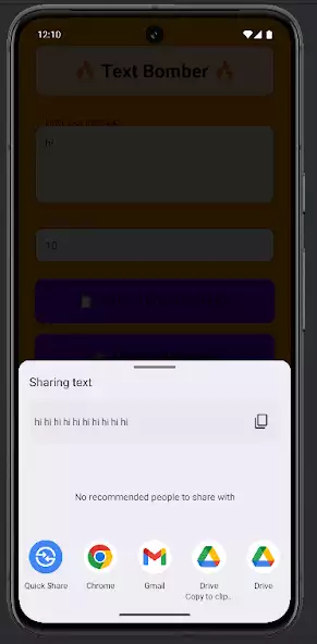 Text Bomber — генератор повтора текста для дублирования слов, фраз заданное количество раз с целью создания вирусных сообщений, массовой рассылки корреспонденции. Интерфейс на русском языке отсутствует. Сгенерированные данные можно сохранять на Google Диске, отправлять по электронной почте, в чаты. Есть реклама, поле ввода символов, всплывающая клавиатура для набора знаков. Ограничений по числу указанных повторений нет. Имеется функция копирования информации в буфер обмена.