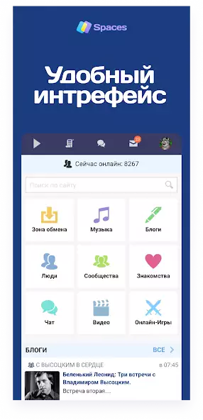 Spaces — социальная сеть для общения, знакомства, вступления в сообщества, обмена файлами, прослушивания музыки, просмотра видеороликов и изображений. Есть показ количества непрочитанных сообщений. Можно играть в онлайн-игры, вести или читать блоги, которые классифицированы на категории: «Информационные технологии», «Юмор», «Новости и происшествия», другие. Доступно добавление аватара. Имеется встроенный аудиоплеер с функциями паузы, проигрывания, перематывания вперед-назад, повтора и перемешивания.