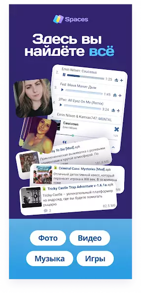 Есть сортировка аудиозаписей по исполнителям, жанрам, к примеру, рок, поп. Аудиофайлы показываются списком с названиями, продолжительностью и доступны для скачивания. Можно смотреть описания игр, комментарии пользователей. Приложение Spaces имеет интерфейс на русском языке. Есть поиск, просмотр анкет с именами, фотографиями, возрастом, прочей информацией. Присутствуют рекомендации, чат и форум.