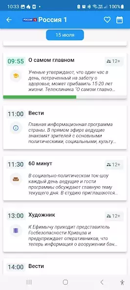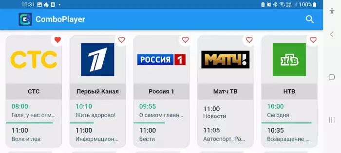 Телеканалы показываются как список миниатюр с названиями, содержанием, их можно оценить лайками, чтобы добавить в раздел «Избранное». Есть интерфейс на русском языке, светлая тема, календарь, навигация стрелками. Контент обозначен тегами, например, «Познавательное». Имеется список телеканалов, где можно смотреть телематериалы. Поддерживаются вертикальная и горизонтальная ориентации экрана.