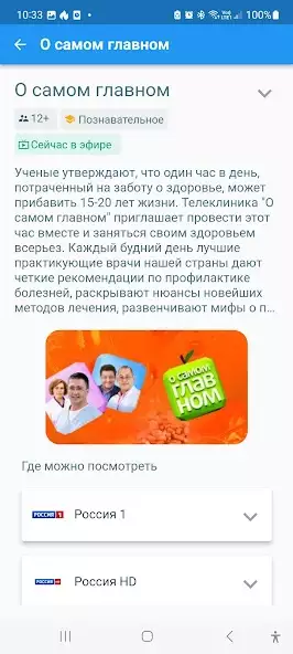 «Программа передач ТВ каналов» предназначена для ознакомления с недельным расписанием показа телепередач, фильмов, сериалов, мультфильмов, ток-шоу, спортивных трансляций и другого контента. Присутствует функция поиска. Есть программа передач для телевизионных каналов: «СТС», «СПАС», «Пятница!», «ТНТ», «НТВ», «Матч ТВ» и других. Доступен просмотр возрастных ограничений, описаний транслируемого контента.