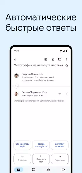 Можно создавать групповые чаты, общаться через видеозвонки, использовать функции быстрого ответа и отмены отправки, прикреплять медиафайлы, добавлять статусы. Исправляет опечатки при вводе текста. Возможно объединять переписки в цепочки, присваивать ярлыки или пометки, удалять и архивировать контент при помощи жеста пролистывания, отвечать на оповещения календаря через приложение. Автоматически заполняет имена получателей из Google-контактов и адресной книги телефона или планшета. Есть реклама.