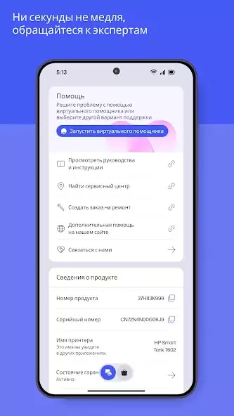 Есть виртуальный помощник и инструкции по использованию устройств. Можно обращаться в чат поддержки, находить сервисные центры, настраивать ярлыки печати, отслеживать сроки гарантии девайсов. Для работы необходимо подключение к интернету. Возможно заходить в свою учетную запись для полноценного использования программы, выбирать количество копий и размер бумаги перед отправкой на печать. Имеются раскраски, прописи и другие проекты для творчества.