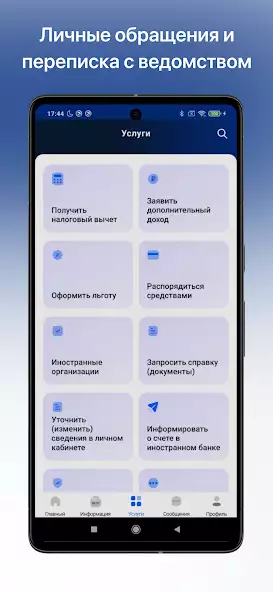 Присутствует встроенная поисковая строка, чат для взаимодействия с налоговыми органами, обучающий тур по ЕНС. Можно подавать, просматривать декларации, скачивать их в формате PDF, досылать документы, получать вычеты, запрашивать справки, изменять личные данные, информировать о дополнительной прибыли и иностранных банковских счетах.