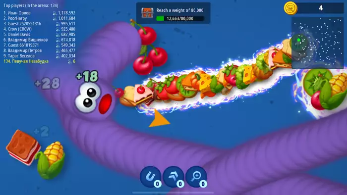 Захват соперника в кольцо помогает его преодолеть, получить еду, которая выпадет. Доступны определение направления перемещения и ускорение движения. Есть сбор монет, которые можно использовать для покупки аксессуаров, костюмов. Есть офлайн- и однопользовательский режимы, внутриигровые покупки. Можно смотреть рейтинг игроков на арене, свое место в таблице лидеров. Присутствуют бонусы для улучшения характеристик героя.
