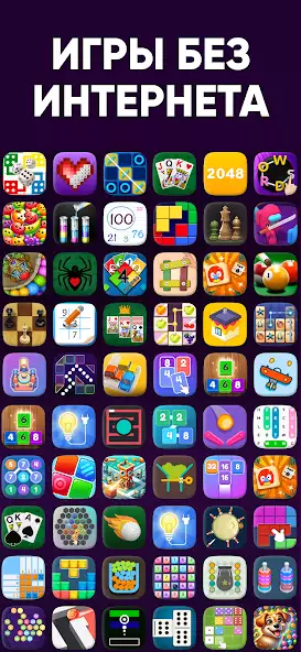 «100+ игры без интернета» – каталог головоломок, аркад, пасьянсов и другого игрового контента, где нужно стрелять шарами, соединять одинаковые фрукты или совершать иные действия. Можно стать бильярдистом, гольфистом или прочим спортсменом. Присутствуют раскраски, шахматы, пазлы и прочий контент. Уровни различаются сложностью. В ассортименте имеются головоломки с блоками взрыва.