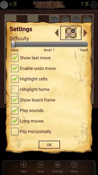 - Настройка внешнего вида доски и игрового процесса: отображение ходов, звукового сопровождения, прочих параметров.