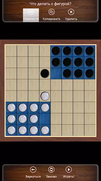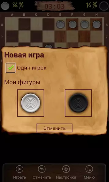 - Выбор одного из пяти уровней сложности и цвета фишек.