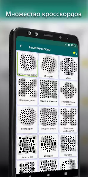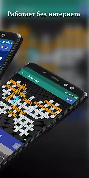 Кроссворды — коллекция более 300 головоломок о разгадывании слов, которые загаданы по вертикали и горизонтали. Возможно использовать неограниченное количество подсказок для открытия понятий, символов. Присутствуют категории: «Тематические», «Классические», «Фигурные», «Сложные», «На одну букву». Имеется функция настройки внешнего вида с отключением темных клеток, выбором цвета ячеек, сменой тем: светлых, темных. За разгаданные понятия начисляются звезды, их общее количество отображается на экране.