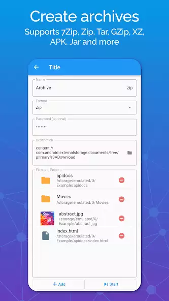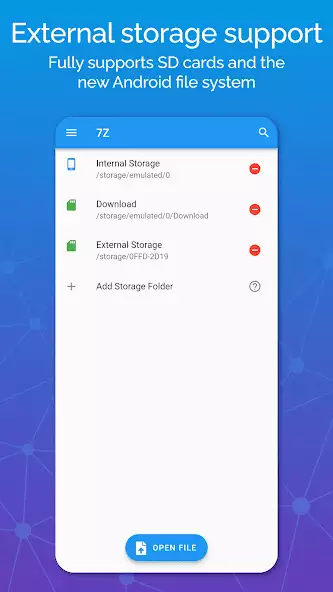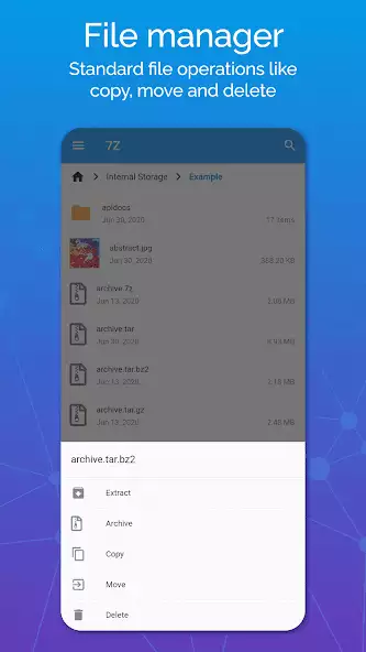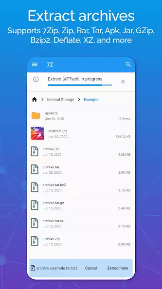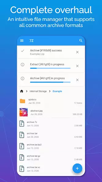 «7Zip и Zip» — архиватор для создания, распаковки архивов, поддерживающий разные форматы, например RAR или XZ. Сжатые документы и картинки можно просматривать без извлечения. Позволяет защитить паролем созданный каталог. Есть возможность отслеживать процесс выгрузки на телефон и проводить ее в фоновом режиме. Имеет функцию интеграции с файловым менеджером устройства. Объединяет два и более файлов в один, уменьшая их вес. Разрешает изучать историю проведенных операций.