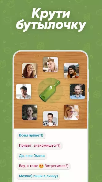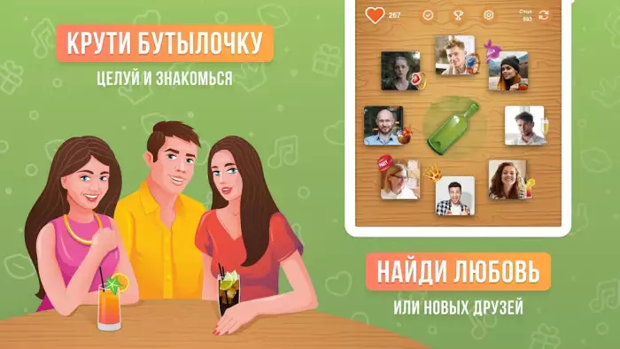 «Целуй и знакомься» — социальная сеть для поиска друзей. Можно общаться в чат-комнатах по интересам, обмениваться презентами, искать людей поблизости, включать музыку. Присутствует онлайн-игра в бутылочку, которую необходимо по очереди крутить, дарить подарок или поцелуй тому, на кого она покажет. Есть служба поддержки. Возможны соревнования в рейтингах лиг за призы, авторизация через аккаунты «Вконтакте», «Одноклассники», «Мой мир», Google, Facebook*. В анкете отображается фото профиля, имя, возраст, город, количество целований, лайков, прочая информация.
