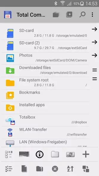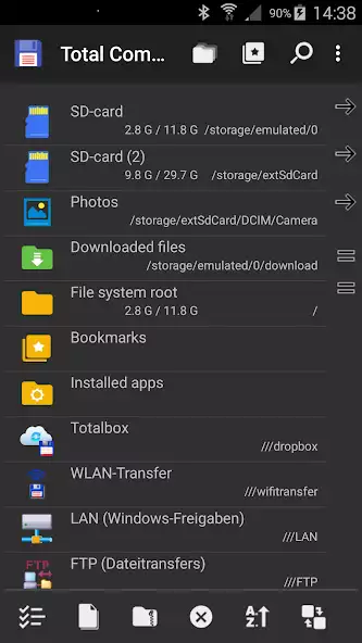 Total Commander — файловый менеджер для создания, копирования, перемещения, переименования, удаления, файлов, каталогов. Возможна упаковка, распаковка архивов в форматах ZIP, RAR. Доступен текстовый редактор. Имеются плагины для просмотра установленных программ, получения доступа к локальной сети. Есть функции изменения разрешений файлов, поиска, настраиваемая панель кнопок. Присутствуют история каталогов, закладки, эскизы для изображений.