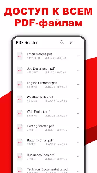 «Программа просмотра PDF» предназначена для открытия, чтения файлов в одноименном формате. Присутствуют функции увеличения, уменьшения масштаба документов. Можно делать заметки, добавлять страницы в закладки. «Программа просмотра PDF» содержит рекламу. Есть возможности перехода на указанную страницу, регулирования яркости, передачи контента через Bluetooth, Android Beam. Публикации показываются как список с названиями, датами, размерами.
