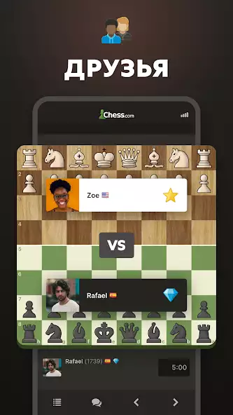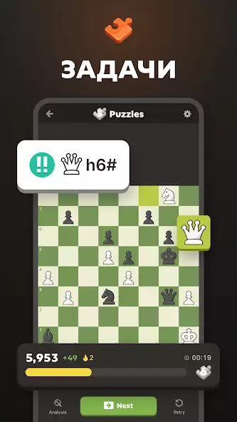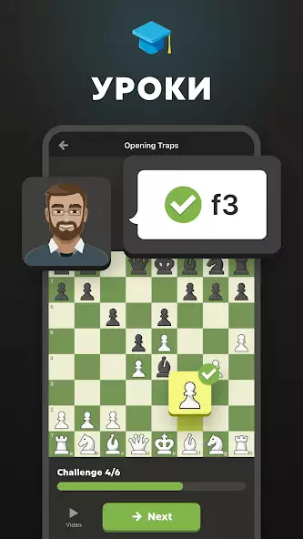 Шахматы — стратегия об управлении 3D-шахматными фигурами с целью поставить мат королю соперника. Имеются пошаговый учебный курс, обучающие видеоматериалы. Присутствуют свыше 20000000 ежедневных партий и 500000 интерактивных задач с советами, подсказками. Нужна регистрация. Можно соревноваться против реальных людей и более 100 противников с искусственным интеллектом, вступать в сообщество. Присутствует реклама. Игра Шахматы доступна в черной теме.