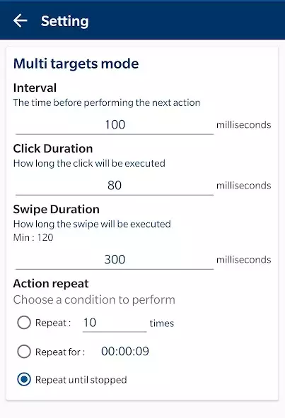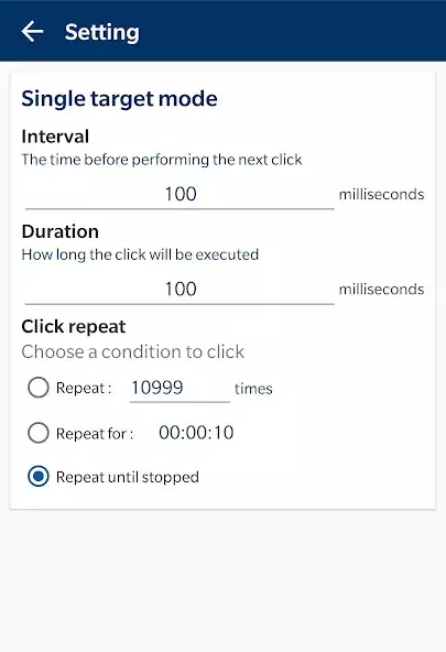 Можно устанавливать задержку, интервал между кликами, продолжительность, количество, очередность щелчков. Для работы необходимо предоставить разрешение службы специальных возможностей устройства. Есть диагностика программы. Имеется инструкция по использованию приложения. Отсутствует реклама.