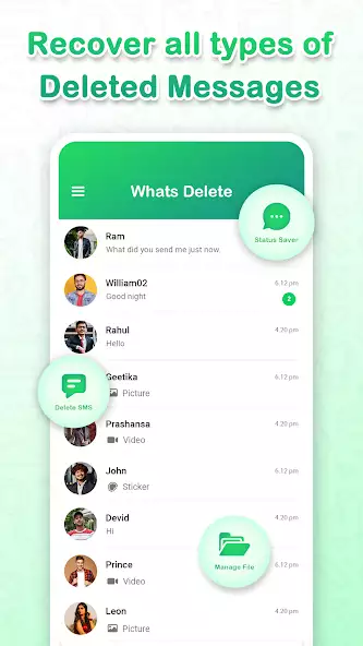 WhatsDeleted — менеджер восстановления данных для отмены удаления сообщений, вложенных медиафайлов: аудиозаписей, GIF и других изображений, стикеров, видеороликов, голосовых заметок в мессенджере WhatsApp. Принцип работы приложения основывается на сканировании уведомлений. Восстановленная информация классифицируется по типу, отображается в программе. Присутствует функционал, определяющий номера телефонов при звонках, отображающий данные о завершенных и пропущенных вызовах, неизвестных абонентах.